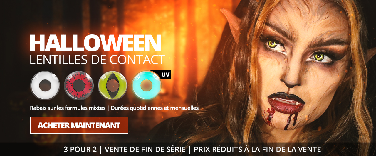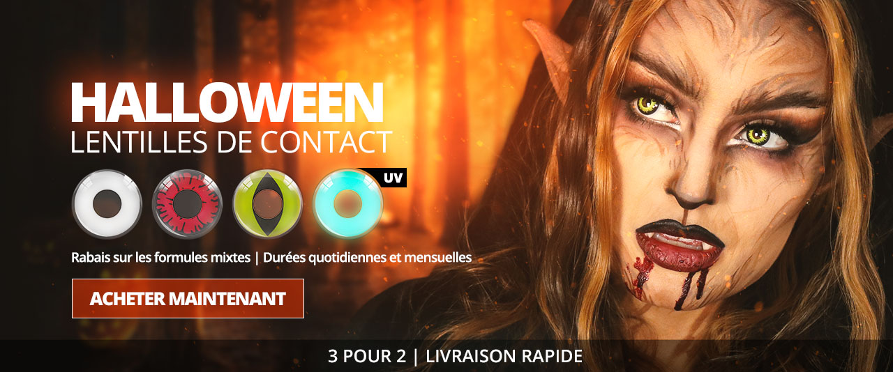 Nous ne pouvons pas non plus oublier Halloween ! Nous voulons que vous vous fassiez plaisir pour cette occasion si spéciale que nous adorons tous avec des lentilles de couleur pour Halloween, qui vous permettront de vous démarquer des autres. Peu importe votre costume (zombie, loup garou, vampire ou démon), avec nos lentilles à effets spéciaux en plus de votre maquillage, vous aurez un look qui en fera pâlir plus d’un !